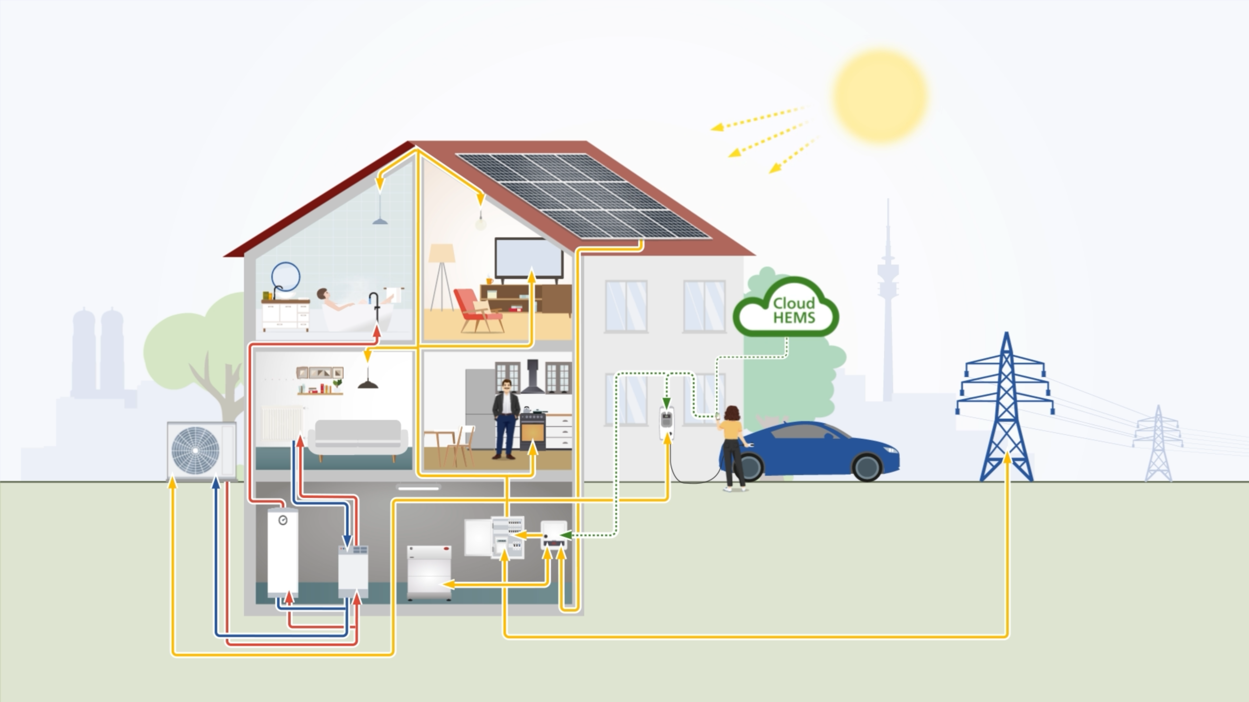 Für die SWM visualisierten wir in einer animierten Infografik, wie Nutzer*innen mit der HEMS App ihr Gebäudemanagement konfigurieren, Verbrauchsdaten ablesen und ihr Energiemanagement kontrollieren können.